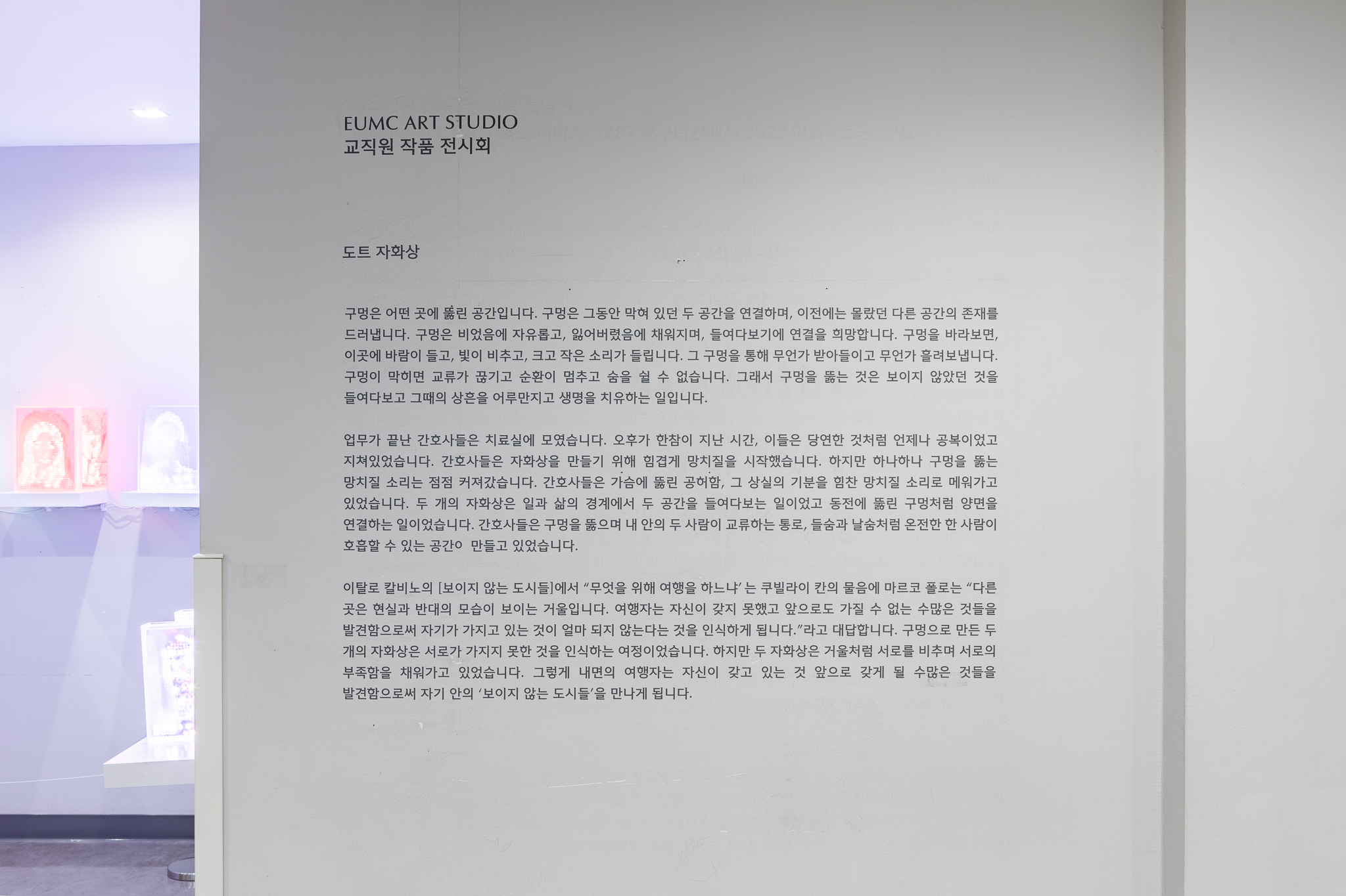 [도트 자화상]은 참여자의 예술적 기술이나 경험에 상관없이 점을 찍거나 뚫는 단순한 작업을 통해 정서적 치유와 성취감을 경험하도록 돕습니다. 반복되는 일상처럼 단순하고 지루하지만, 지속적인 시간의 축적은 결국 하나의 작품으로 탄생합니다. 이렇듯 완성된 [도트 자화상]은 자신을 마주하고 꿰뚫음으로써 감정의 내면을 들여다보게 합니다. 참여자들은 점 하나하나가 쌓여 만든 자신의 모습을 보며, 자신의 상황과 감정을 이해하고 어루만지게 됩니다.